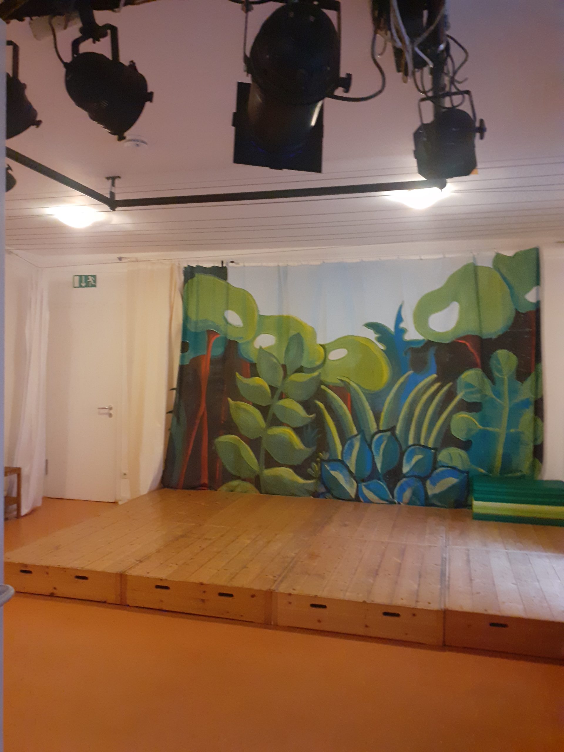 Unser Theaterraum hat eine richtige Bühne und Ausstattung mit Scheinwerfern und Lichtpult. Er kann sich auch in ein Atelier oder Werkstattraum verwandeln.